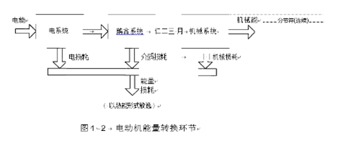 電動機內(nèi)部實現(xiàn)能量轉(zhuǎn)換包括電系統(tǒng)、搞合系統(tǒng) 和機械系統(tǒng)三個環(huán)節(jié),如圖 1 - 2 所示 。電動機通常是在其接線端子上輸入電能,在鈾上輸出機械功率。外電路電能通過搞合 系統(tǒng)在機械系統(tǒng)中產(chǎn)生機械能,在機械系統(tǒng)的抽頭上以機械能輸出,在上述能量轉(zhuǎn)換過程中,三個系統(tǒng)都會產(chǎn)生部分能量損失,最終都以熱能的形式向周圍環(huán)境散逸。